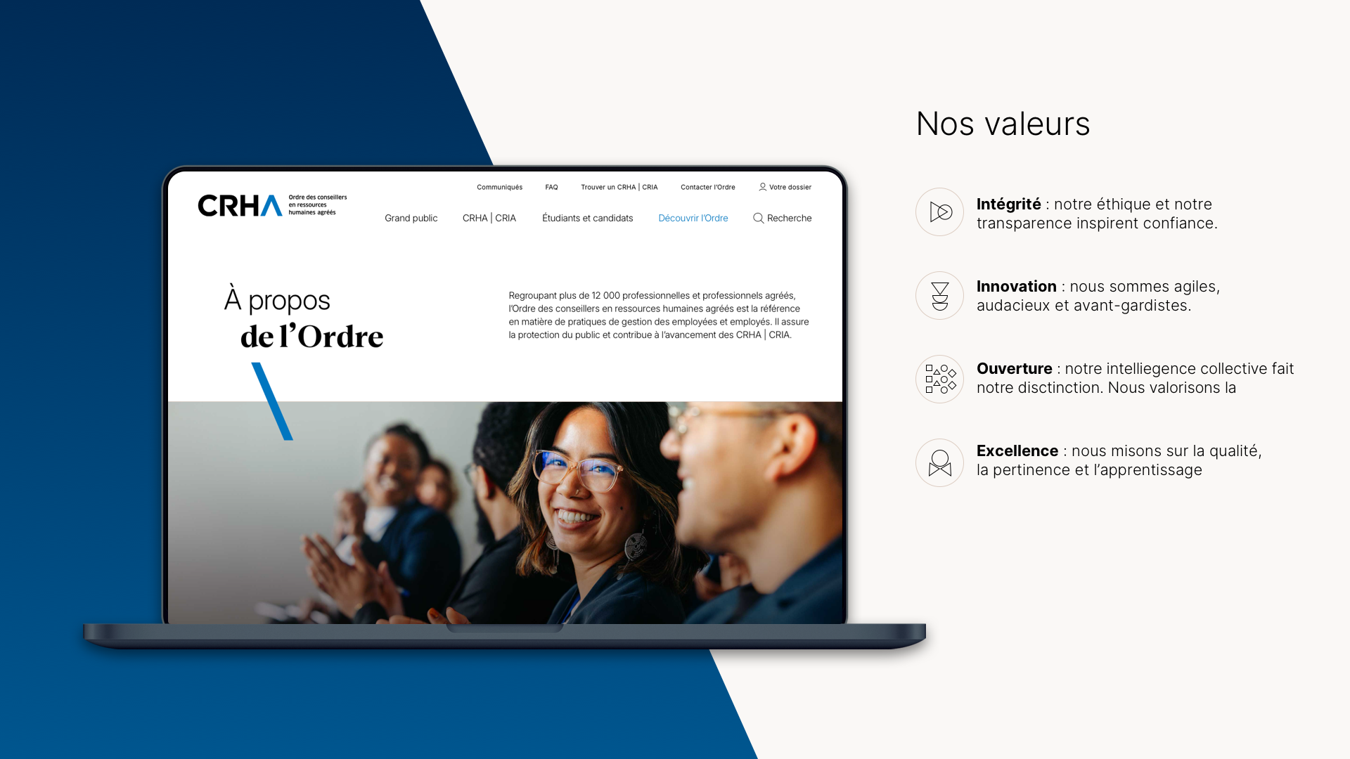 L’Ordre des conseillers en ressources humaines agréés (CRHA) a mandaté notre équipe pour une refonte complète de son site web, un projet stratégique visant à améliorer l’accessibilité de l’information, l’expérience utilisateur et la performance du site, tout en modernisant l’écosystème numérique.
